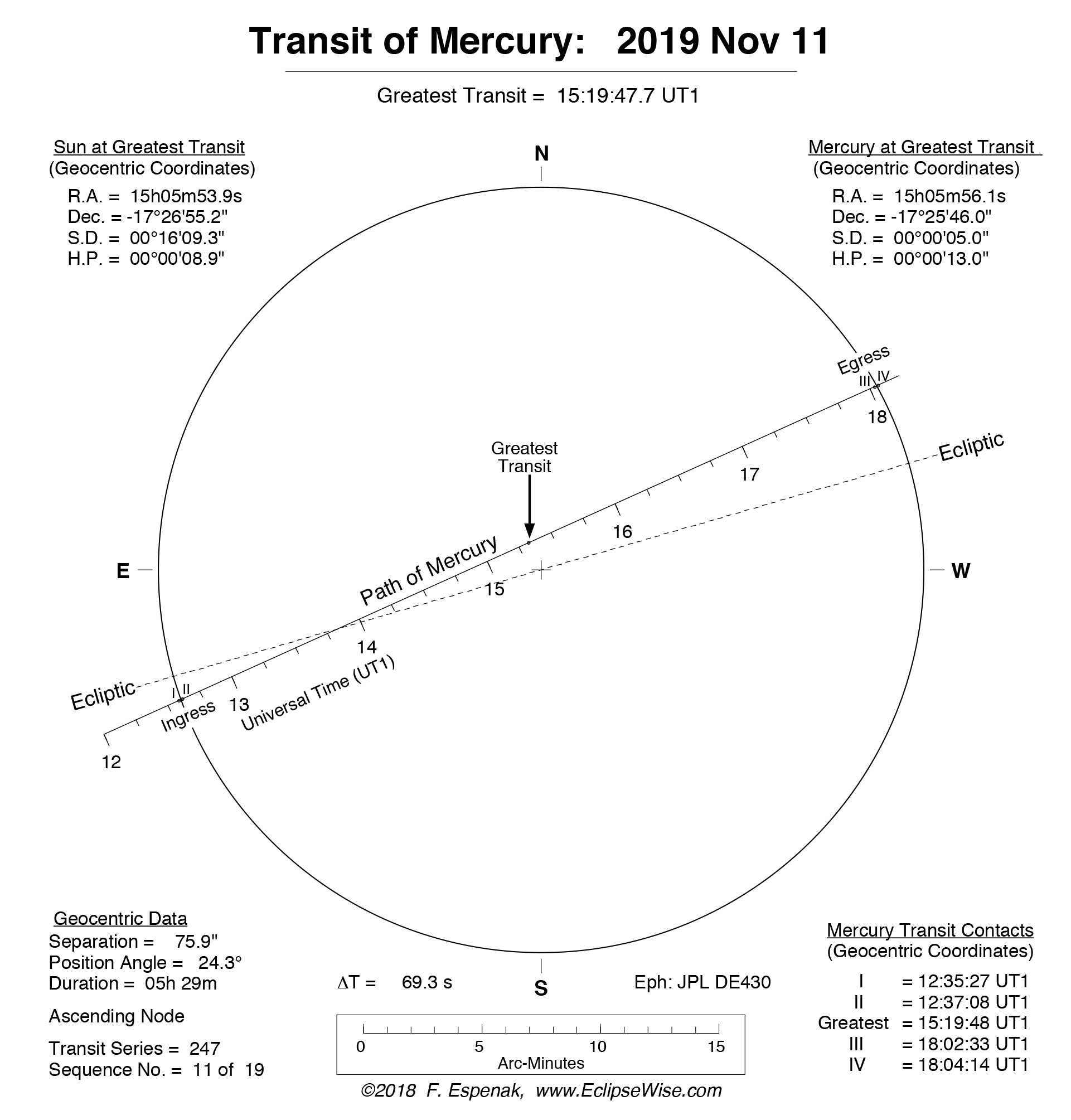 Table 1 gives the times of major events during the 2019 transit in Universal Time (UT1). Greatest transit is the instant when Mercury passes closest to the Sun's center (i.e., minimum separation). At this time, the geocentric angular distance between the centers of Mercury and the Sun will be 75.9 arc-seconds. The position angle is the direction of Mercury with respect to the center of the Sun's disk as measured counterclockwise from the celestial north point on the Sun.