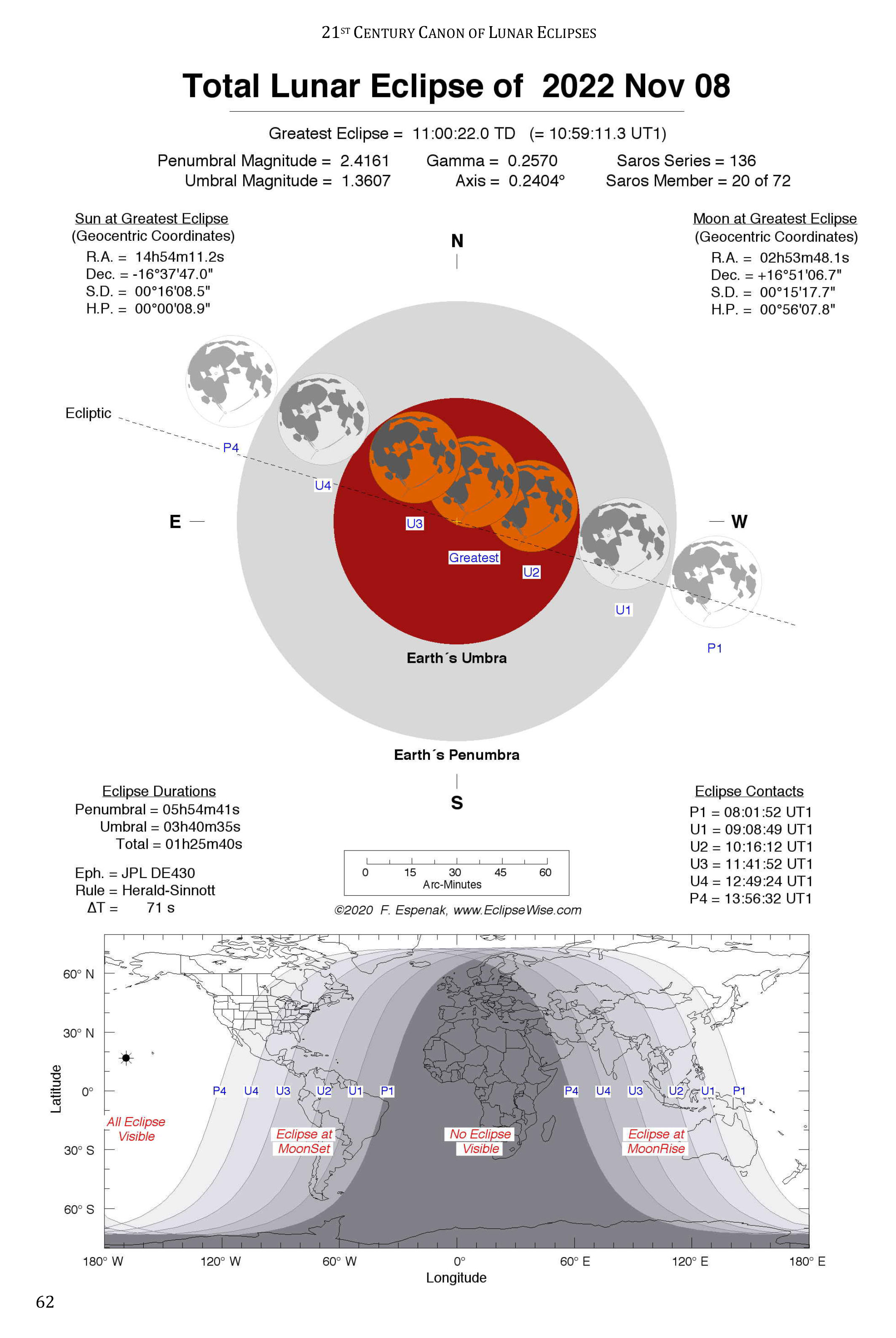 The 21st Century Canon of Lunar Eclipses is the modern successor to the NASA publication Fifty Year Canon of Lunar Eclipses. The 21st Century Canon is far more precise and includes details on the face of the Moon. It uses modern and more accurate ephemerides for the Sun and Moon (JPL DE430). It also uses an improved parameters and an elliptical model for Earth's shadows. Compare the diagrams and maps of the 2022 total eclipse from the two canons above to see the improvement.
