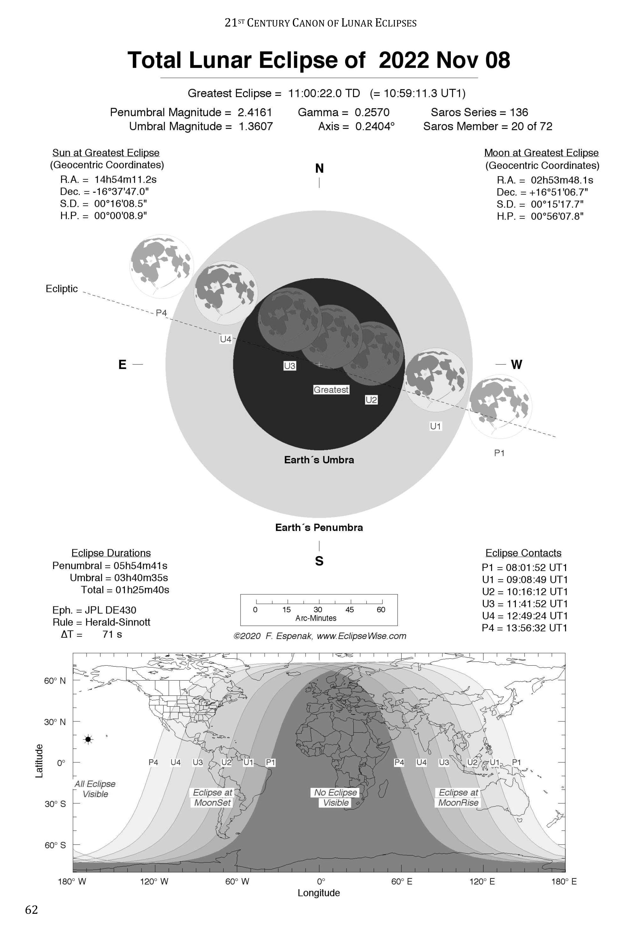 Below are two examples of the full-page lunar eclipse diagrams from Appendix C. They are the Black and White and Full Color versions of the figures for the Total Lunar Eclipse of 2022 Nov 08. For comparison, the third figure to the right is from the 1987 NASA publication Fifty Year Canon of Lunar Eclipses for the same eclipse.
