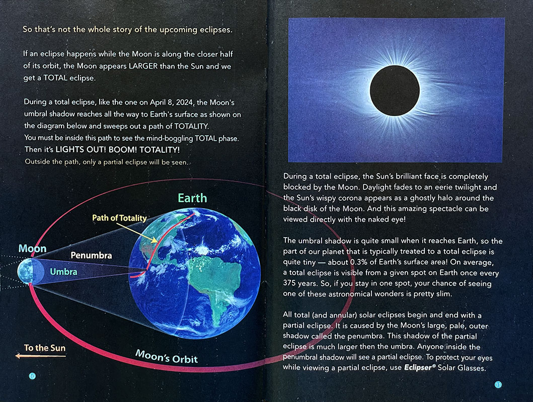 Get Eclipsed is an easy to read, family friendly, inexpensive eclipse guide for the entire family. It tells you everything you need to know about the upcoming annular and total eclipses of the Sun in 2023 and 2024. And it comes with two pairs of special glasses for safely watching the partial eclipse phases and annularity.