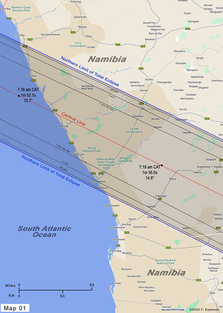 The path of totality on each map clearly identifies the northern and southern limits as well as the central line. The total eclipse can only be seen inside this path. Gray lines within the path mark the duration of the total eclipse in 30 second steps. This makes it easy to estimate the length of totality from any location in the eclipse path.