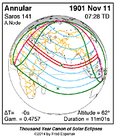 | 1901 Nov 11 | 07:28:21 | Annular | 141 | 0.922 | 11m01s | ne Africa, Asia, w Europe