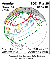| 1903 Mar 29 | 01:35:23 | Annular | 118 | 0.977 | 01m53s | e Asia, nw North America