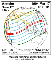 | 1904 Mar 17 | 05:40:44 | Annular | 128 | 0.937 | 08m07s | e Africa, s Asia