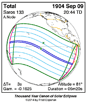 | 1904 Sep 09 | 20:44:21 | Total | 133 | 1.071 | 06m20s | Atlantic, nw South America