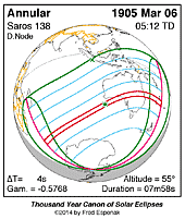 | 1905 Mar 06 | 05:12:26 | Annular | 138 | 0.927 | 07m58s | Australia, Antarctica, s Indies