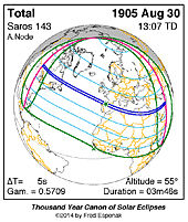 | 1905 Aug 30 | 13:07:26 | Total | 143 | 1.048 | 03m46s | ne North America, n Africa, Europe, w Asia