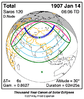 | 1907 Jan 14 | 06:05:43 | Total | 120 | 1.028 | 02m25s | c Asia, ne Africa