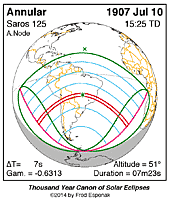 | 1907 Jul 10 | 15:24:32 | Annular | 125 | 0.946 | 07m23s | South America, Central America, Antarctica