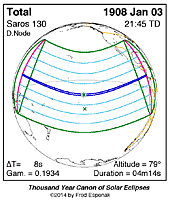 | 1908 Jan 03 | 21:45:21 | Total | 130 | 1.044 | 04m14s | ne Australia, w North America, nw South America