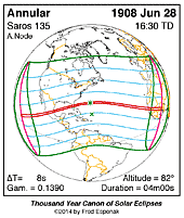 | 1908 Jun 28 | 16:29:51 | Annular | 135 | 0.965 | 04m00s | America's, w Africa, w Europe