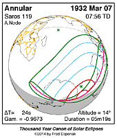 | 1932 Mar 07 | 07:55:50 | Annular | 119 | 0.928 | 05m19s | Antarctica, Australia, s Indies