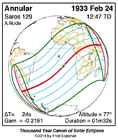 | 1933 Feb 24 | 12:46:39 | Annular | 129 | 0.984 | 01m32s | s South America, Africa, Antarctica