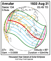 | 1933 Aug 21 | 05:49:11 | Annular | 134 | 0.980 | 02m04s | ne Africa, c Asia, Indies, Australia