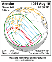 | 1934 Aug 10 | 08:37:48 | Annular | 144 | 0.944 | 06m33s | s Africa, Antarctica,