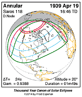 | 1939 Apr 19 | 16:45:53 | Annular | 118 | 0.973 | 01m49s | North America, n Europe, Russia
