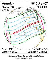 | 1940 Apr 07 | 20:21:21 | Annular | 128 | 0.939 | 07m30s | North America, Central America, n South America,