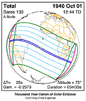 | 1940 Oct 01 | 12:44:06 | Total | 133 | 1.064 | 05m35s | South America, s Africa