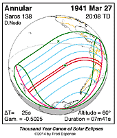 | 1941 Mar 27 | 20:08:08 | Annular | 138 | 0.935 | 07m41s | Antarctica, South America, Central America