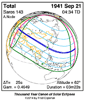 | 1941 Sep 21 | 04:34:03 | Total | 143 | 1.038 | 03m22s | Asia, Indies, Australia, Middle East