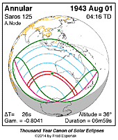 | 1943 Aug 01 | 04:16:13 | Annular | 125 | 0.941 | 06m59s | Madagascar, Antarctica, Indies, Australia