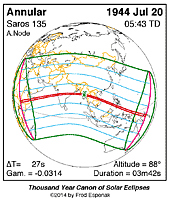 | 1944 Jul 20 | 05:43:13 | Annular | 135 | 0.970 | 03m42s | s Asia, e Africa, Indies, Australia