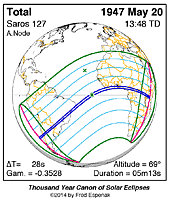 | 1947 May 20 | 13:47:47 | Total | 127 | 1.056 | 05m13s | South America, Africa