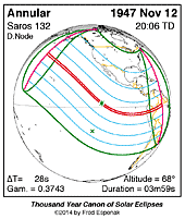 | 1947 Nov 12 | 20:05:37 | Annular | 132 | 0.965 | 03m59s | N & South America