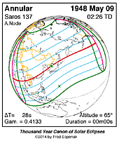 | 1948 May 09 | 02:26:04 | Annular | 137 | 1.000 | 00m00s | Asia, Indies, nw North America
