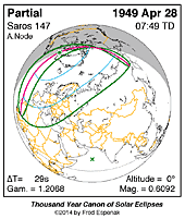 | 1949 Apr 28 | 07:48:53 | Partial | 147 | 0.609 | - | n Africa, Europe, w Asia, n North America |