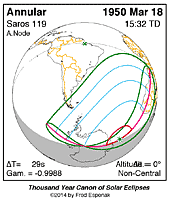 | 1950 Mar 18 | 15:32:01 | Annular | 119 | 0.962 | - | s Africa, s South America, Antarctica