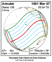 | 1951 Mar 07 | 20:53:40 | Annular | 129 | 0.990 | 00m59s | New Zealand, Pacific, s North America, nw South America