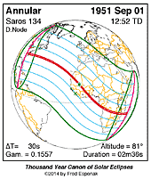 | 1951 Sep 01 | 12:51:51 | Annular | 134 | 0.975 | 02m36s | e North America, Caribbean, n South America, w Europe, Africa