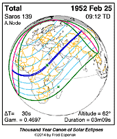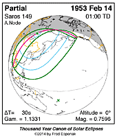 | 1953 Feb 14 | 00:59:30 | Partial | 149 | 0.760 | - | e Asia, Pacific, Alaska |
