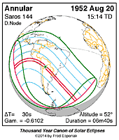| 1952 Aug 20 | 15:13:35 | Annular | 144 | 0.942 | 06m40s | C. America, South America