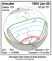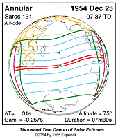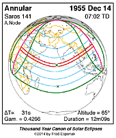 | 1955 Dec 14 | 07:02:25 | Annular | 141 | 0.918 | 12m09s | c & e Africa, Mid East, Asia, East Indies