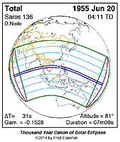 | 1955 Jun 20 | 04:10:42 | Total | 136 | 1.078 | 07m08s | e Africa, e Asia, East Indies, n Australia
