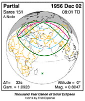 | 1956 Dec 02 | 08:00:35 | Partial | 151 | 0.805 | - | Europe, n Africa, Mid East, c Asia |