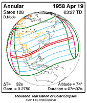 | 1958 Apr 19 | 03:27:17 | Annular | 128 | 0.941 | 07m07s | Asia, East Indies, Pacific