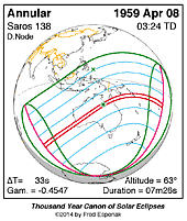 | 1959 Apr 08 | 03:24:08 | Annular | 138 | 0.940 | 07m26s | East Indies, Australia, New Zealand, Pacific