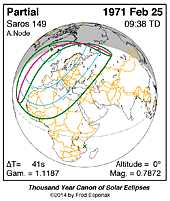 | 1971 Feb 25 | 09:38:07 | Partial | 149 | 0.787 | - | Europe, nw Africa, w Asia |