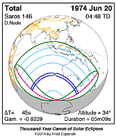 | 1974 Jun 20 | 04:48:04 | Total | 146 | 1.059 | 05m09s | Madagascar, East Indies, Australia