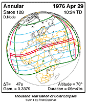 | 1976 Apr 29 | 10:24:18 | Annular | 128 | 0.942 | 06m41s | Europe, Africa, Asia