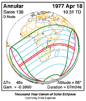 | 1977 Apr 18 | 10:31:30 | Annular | 138 | 0.945 | 07m04s | Africa, s Asia