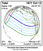 | 1977 Oct 12 | 20:27:27 | Total | 143 | 1.027 | 02m37s | North America, nw South America