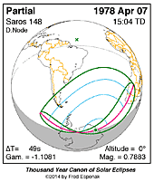 | 1978 Apr 07 | 15:03:47 | Partial | 148 | 0.788 | - | s South America, s Africa, Antarctica |