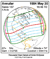 | 1984 May 30 | 16:45:42 | Annular | 137 | 0.998 | 00m11s | N. & C. America, Europe, nw Africa