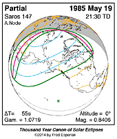 | 1985 May 19 | 21:29:38 | Partial | 147 | 0.841 | - | ne Asia, n North America |