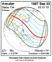 | 1987 Sep 23 | 03:12:22 | Annular | 134 | 0.963 | 03m49s | Asia, East Indies, Australia