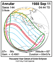 | 1988 Sep 11 | 04:44:29 | Annular | 144 | 0.938 | 06m57s | e Africa, s Asia, Australia